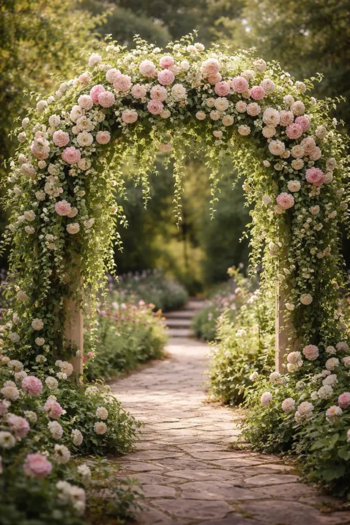 1. Cascading Garden Roses and Trailing Ivy Arch