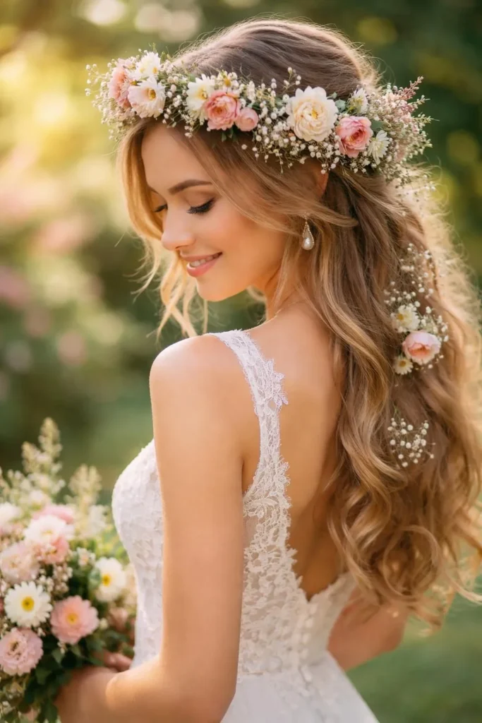 A full flower crown in matching wedding colors ties the bridal look directly to the floral theme of the day. For a cohesive look, use the same blooms from your bouquet — perhaps blush garden roses, white ranunculus, and dusty miller — woven into a delicate crown. Bridesmaids can wear smaller, simpler versions using a single flower variety for an elegant, unified aesthetic.