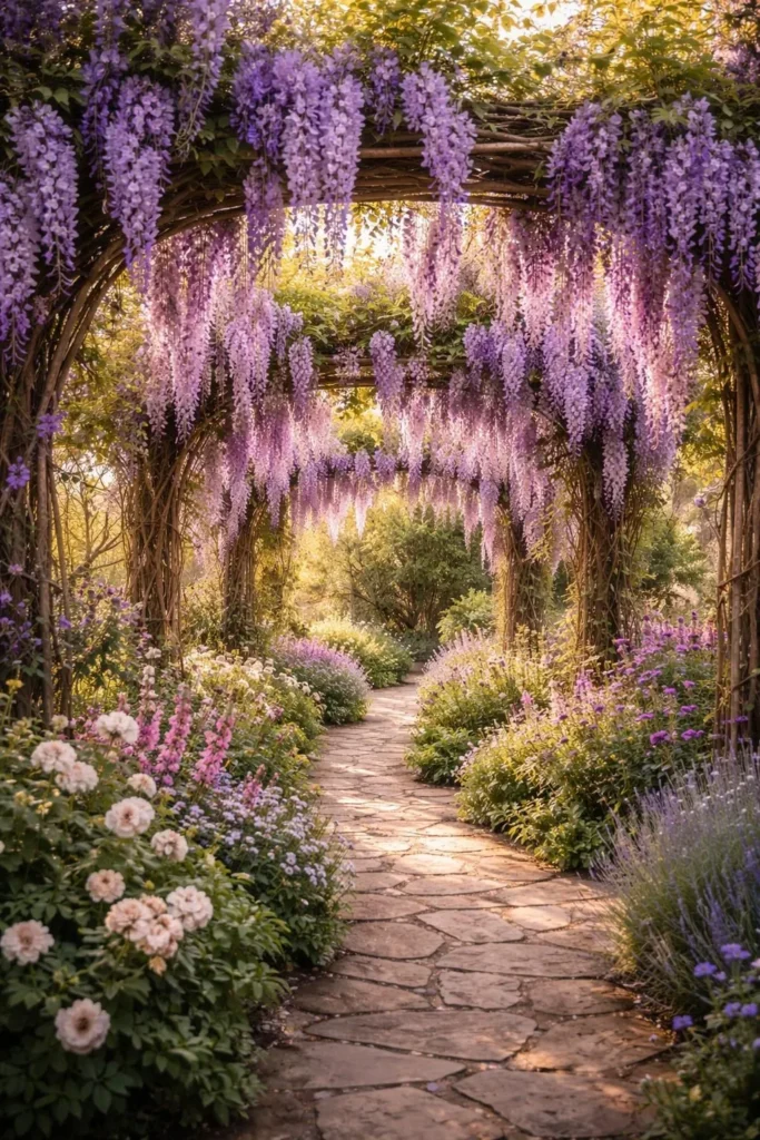 If there is one flower that embodies the fairy tale garden aesthetic more than any other, it may well be wisteria. Those long, cascading purple and lavender clusters draped over wooden pergolas, stone walls, and garden arches look like they belong in a dream sequence — because they genuinely do.