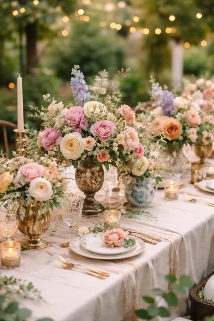 Think amber glass bottles filled with dahlias, mercury glass bowls overflowing with sweet peas, bronze urns planted with trailing ivy and garden roses, and old ceramic pitchers stuffed with sunflowers and lavender. The mix of textures and heights creates a tablespace that is visually rich and deeply romantic. No two tables look exactly alike, and that is precisely the point.