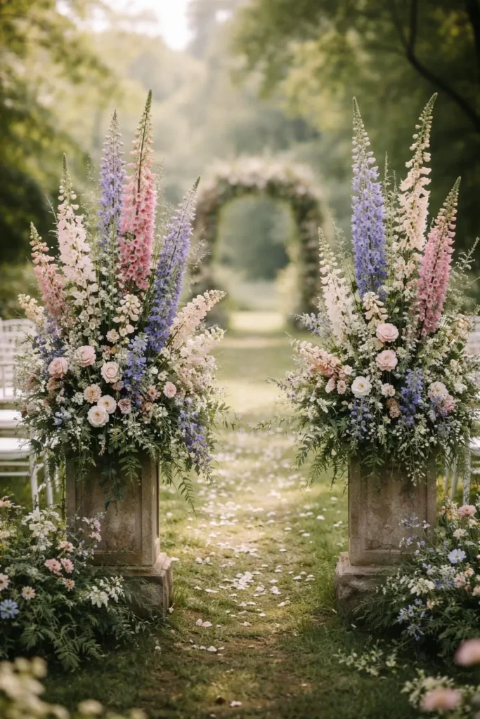 Best for: Tall dramatic floral arrangements, English garden wedding aesthetics, ceremony entrance styling, early summer garden weddings.
