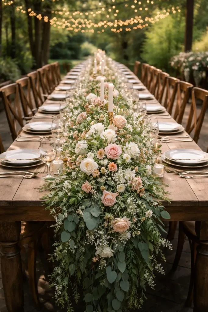 Best for: Long banquet-style reception tables, romantic garden evening receptions, organic and natural floral aesthetics, candlelit dinner settings.